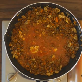 玉ねぎとにんじんがしんなりしてきたら、牛挽き肉、水切りした豆腐を入れ、そぼろ状になるまで炒めます。