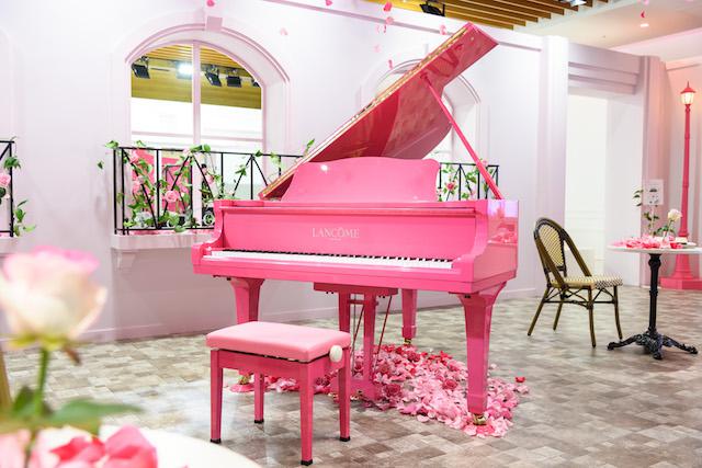 パリの街をイメージしたという会場は、幸せの象徴である、ピンクのバラの花びらがテーブルやピアノ(なんとピンク!!)にあしらわれ、ドラマティックな空間に。足を踏み入れるだけで、女子力が高まりそうなハッピーなムードが満ち溢れていました。