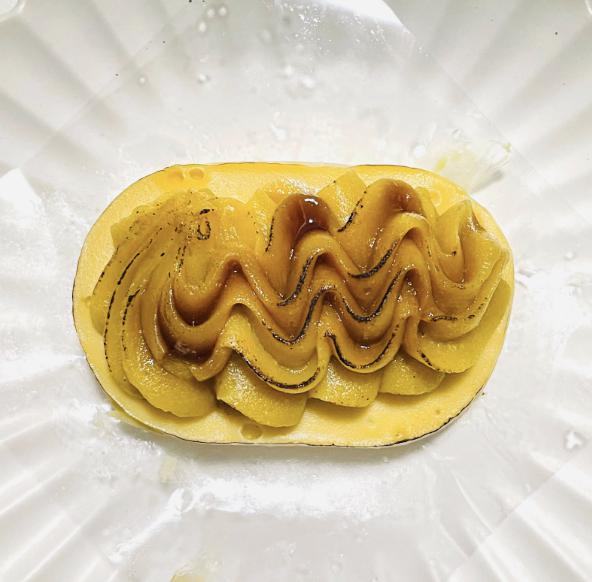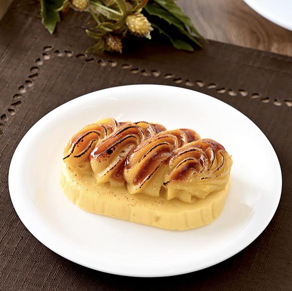 クリームチーズを加え、なめらかに仕上げたさつま芋テリーヌに、濃厚なスイートポテトとカラメルソースを絞り表面を炙って香ばしく仕上げました。