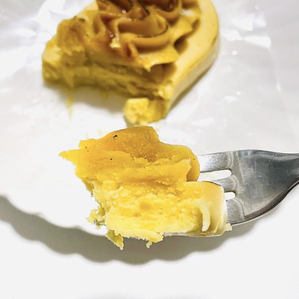 スイートポテト部分は、さつまいもの風味が強く、香ばしいカラメルの風味が口の中に広がります。甘さは控えめながらも、さつまいもの味わいをしっかりと楽しめます!