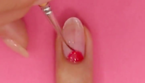 クリアを混ぜた赤のジェルを爪の根元に、丸を描くように塗っていきます。クリアジェルを混ぜるだけで、一気に透明感がアップします!