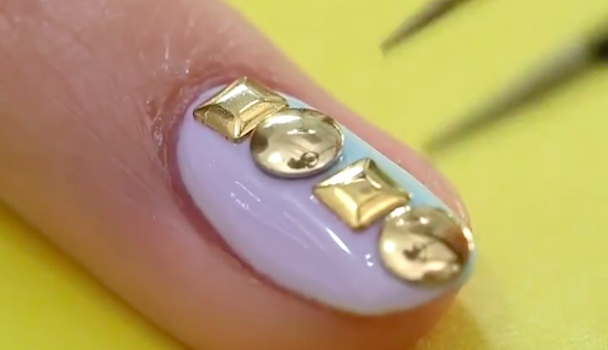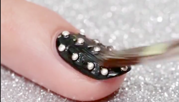 ジェルをのり代わりに塗り、シルバーのスタッズをのせていきます。等間隔で均等にのせるのがポイントです!