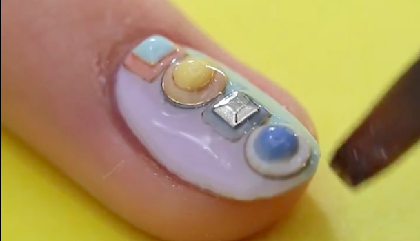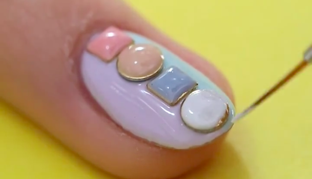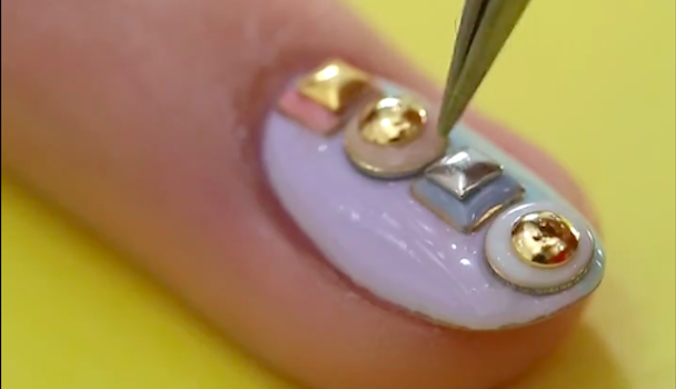 ジェルを塗って、スタッズを境目に乗せていきます。スタッズの形は四角と丸、大きさは少し大きめがオススメです!