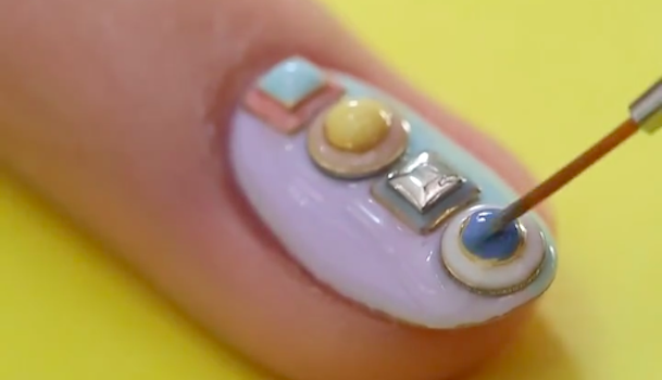 塗り終えたら、手順4でのせたスタッズより一回り小さめのものを重ねていきます。ひとつシルバーのスタッズをのせるのがポイント。