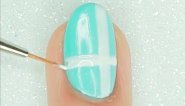 白のジェルで縦と横にラインを引いていきます。少し太めに引くのがポイントです!