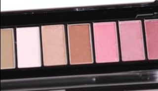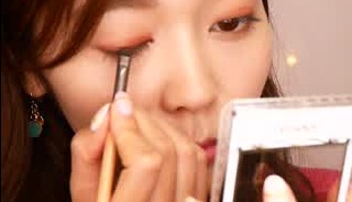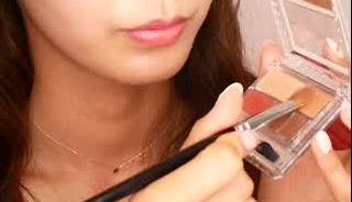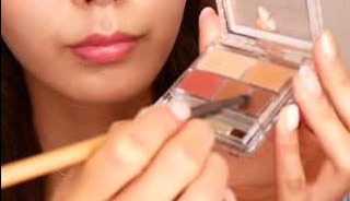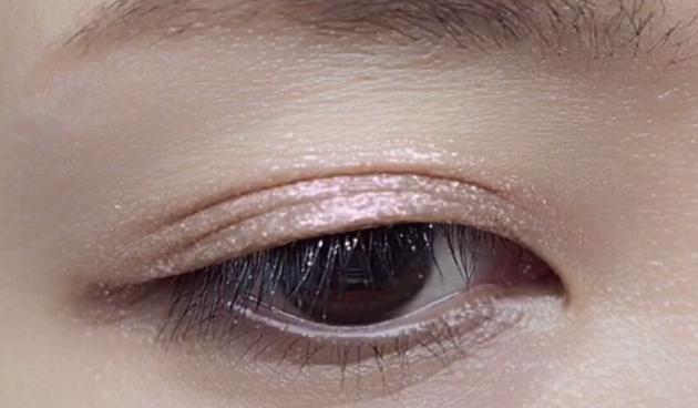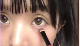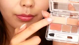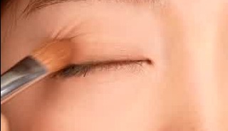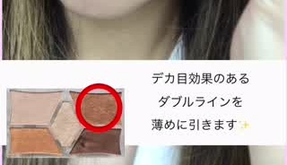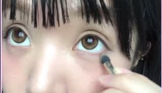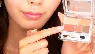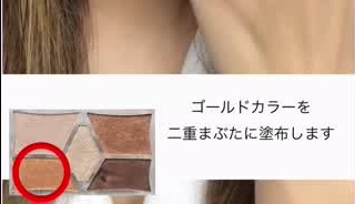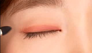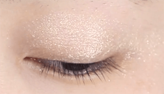 右上の、薄いブラウンカラーをアイシャドウブラシにとり、上まぶたの二重の幅のラインにのせていきます。