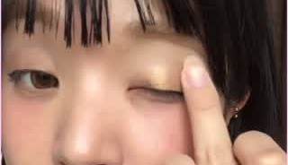 左下のゴールドカラーを上まぶた全体に塗ります。指を使って塗ると肌なじみがよく、派手すぎない印象になりますよ♡
