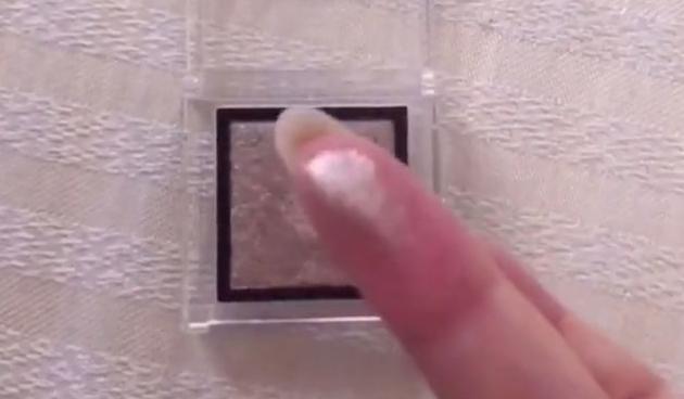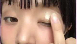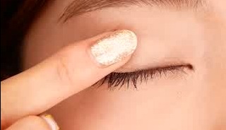 左上のベースカラーをまぶたにのせます。指を使って、上まぶた全体になじませるようにのせていきましょう。