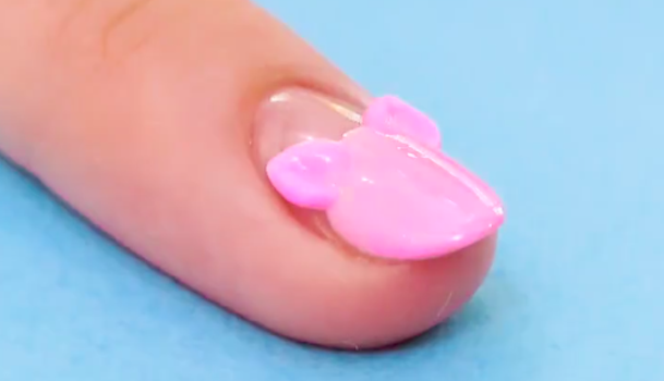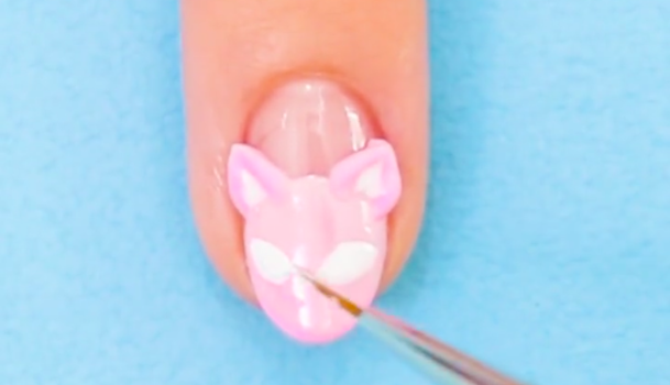 爪全体にベースジェルを塗り硬化させ、余分な未硬化ジェルを拭き取ります。爪の半分から上にピンクのカラージェルを使い猫の顔の輪郭を描きます。薄いピンクのカラージェルを使うことで派手すぎない癒し系ネイルに仕上がりますよ。