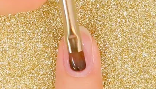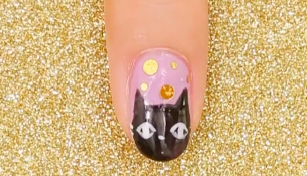 パーツをのせるために猫が描いていない部分にクリアジェルを軽く塗ります。サイズの違うゴールドのパーツを木の棒を使ってのせます。最後にトップジェルを爪全体(エッジの部分も)に塗ります。硬化させ、余分な未硬化ジェルを拭き取ったらできあがりです。