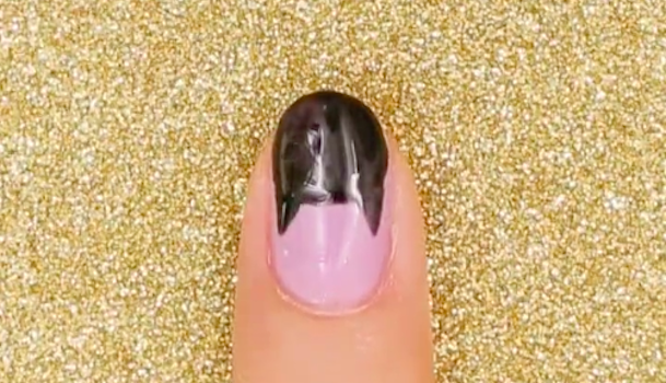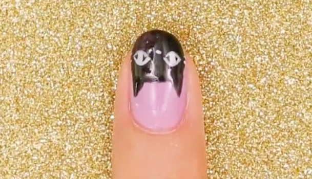 黒のジェルを使って爪の半分から上の部分に猫の顔の輪郭と耳を描きます。耳は細い筆を使って描いてください。
