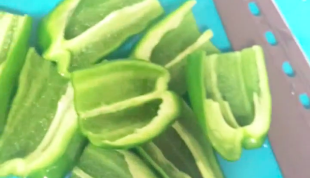 食べる分のピーマンを縦半分にカットします。カットしたら、へたを取り洗いましょう。