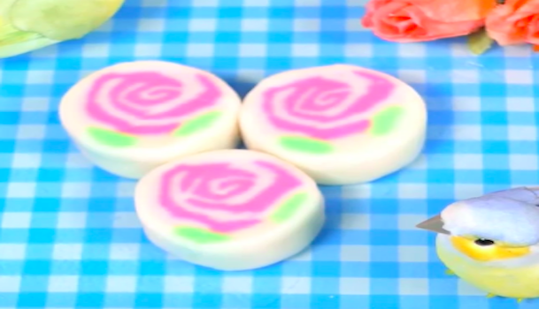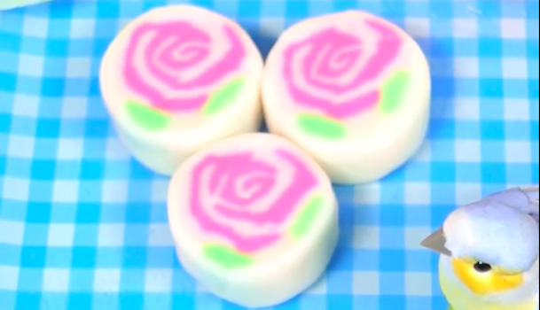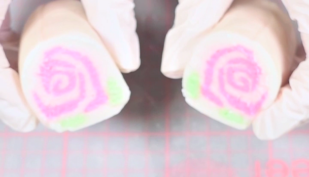 お餅に着色料を加えます。濃いピンク75グラム、薄いピンク75グラム、緑20グラム、白80グラムの塊を作り、いくつかに切り、生地を伸ばしていく。ピンクを2種類重ねて、ラップを使いくるくる巻いてください。緑と白を周りにくっつけ、棒状の形にします。好きなサイズにカットして完成。