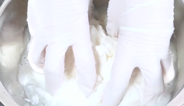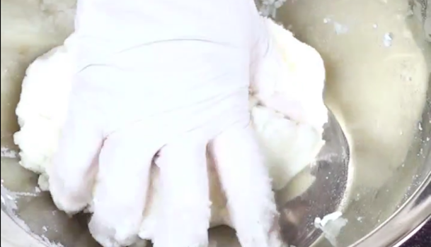 菜箸でよくかき混ぜてさます。ひとかたまりになり、手に生地がくっつかなくなったらボウルから出します。