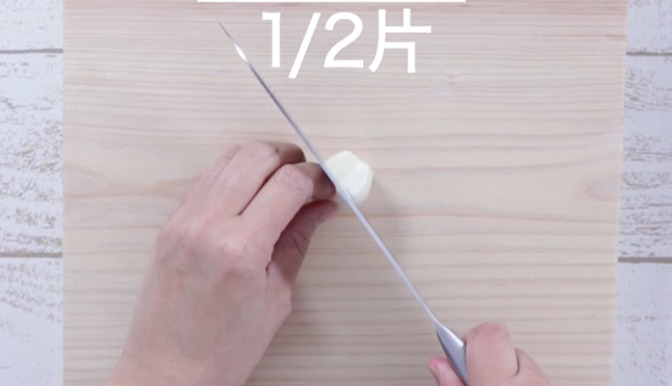 にんにく2分の1片をみじん切りにします。アスパラは3分の1の皮をむき、斜めにカット。レモンは2分の1をくし切りにしてから斜めにカットします。残りの半分は皮を向いて、その皮を細かくみじんぎりにします。皮をみじんぎりにして使うことで、レモンの風味を引き立たせるのがポイントです。