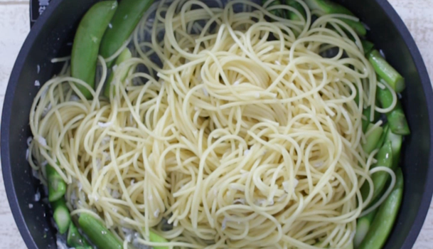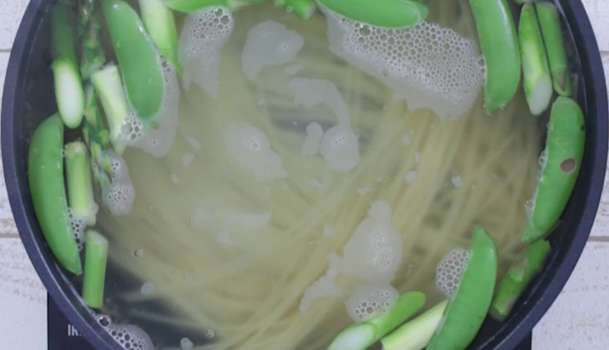 筋とヘタを取ったスナップエンドウとカットしたアスパラガスも一緒に鍋にいれて、茹でましょう。茹で汁をあとで使用するため、少し残しておきましょう。