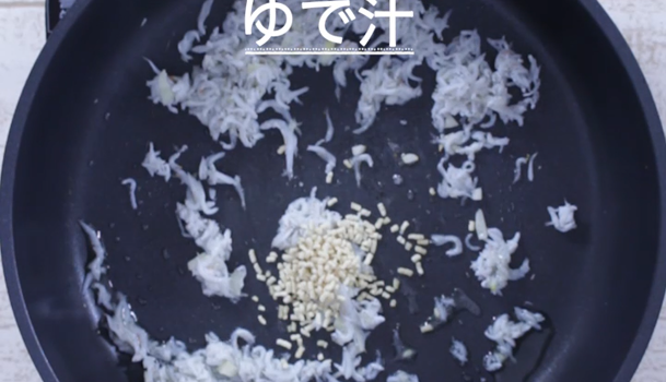 フライパンにオリーブオイル適量、にんにく2分の1片入れて、中火でにんにくの香りがたつまで炒めます。香りがたってきたらしらすを加えて、軽く炒めたら、一度火をとめる。