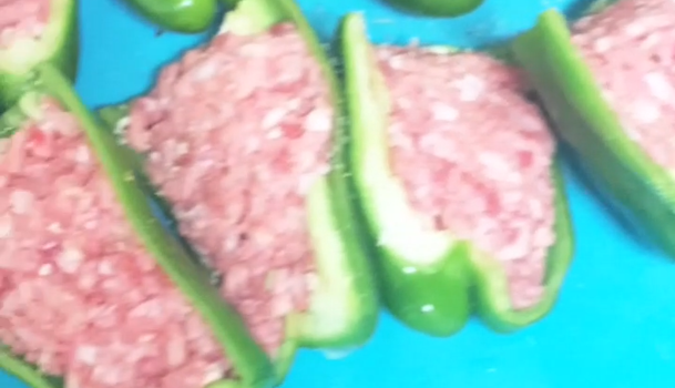 ピーマンに塩コショウしたひき肉を詰めます。(クレイジーソルトなら、岩塩ベースでハーブがきいているのでオススメです!)