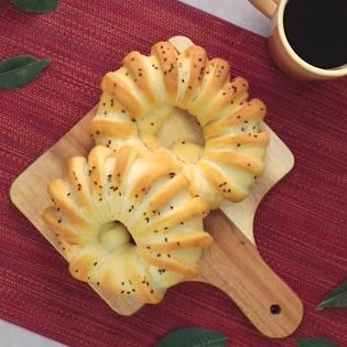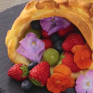 ブーケ型に焼いたパンの中に、たくさんのフルーツを入れた華やかなパン♪フルーツ次第で印象がガラッと変わるので、アレンジを楽しめますよ。