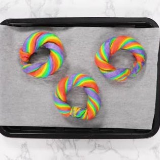 「なにこれ!?」と目を疑ってしまうほどカラフルなベーグル。味は良いので、ご安心ください♪