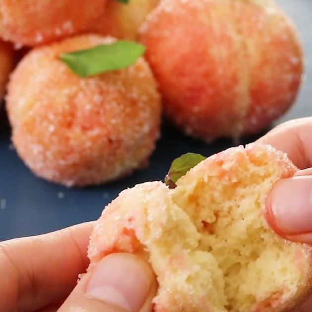 ホットケーキミックスをたこ焼き器で焼いて、シロップと砂糖でコーティングして完成。本物の桃そっくりの見た目でとってもかわいい♡一口サイズなので、パクパク食べられますね。