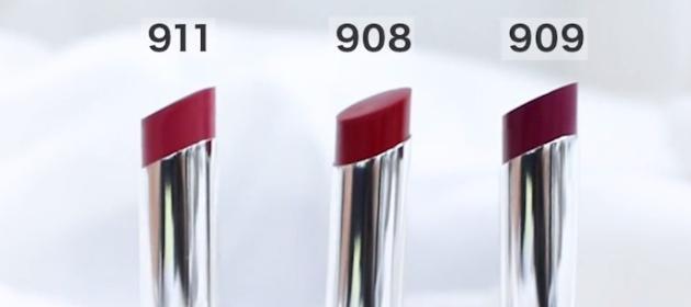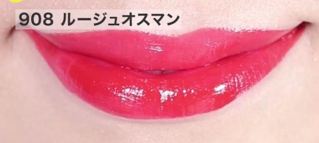 「908 ルージュオスマン」は、青み系の赤リップ。黒髪の方や黒コーデに映えるカラーです。