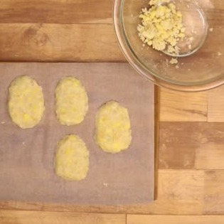 手順2のじゃがいもを小判型になるように形を整えて、クッキングシートの上に並べます。