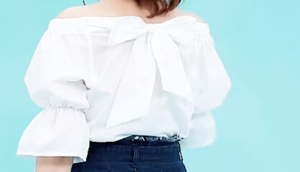 オフショルダーで大胆に肌見せ!小顔効果を狙えちゃいますよ。