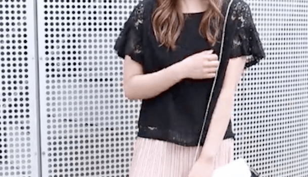 ピンクのプリーツスカートは、黒のトップスと合わせることで甘さが軽くなります!