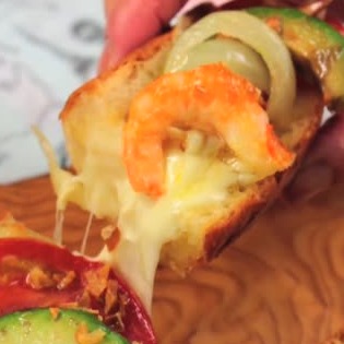 見た目にも華やかなフランスパンボートレシピです。アボカド、モッツァレラチーズ、トマト、エビ、玉ねぎなどたっぷりの具材に特製のにんにくソースをかけて焼き上げます♡
