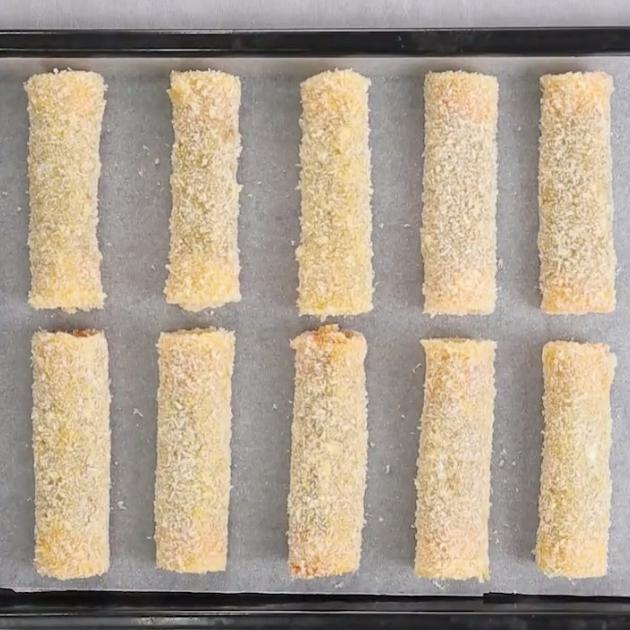 パン粉をまぶしたカネロニを190度のオーブンで15分焼きます。