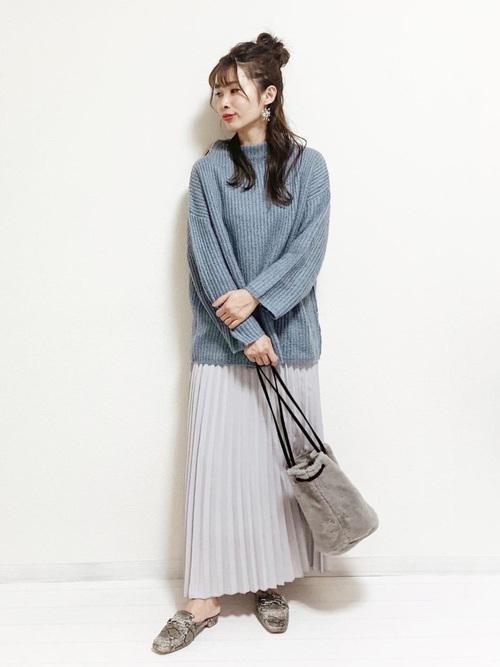 くすみカラーやグレーもブルベ夏さんが似合うカラー。やわらかい素材のスカートと合わせると、よりブルベ夏さんの良さを引き出すことができますよ。
