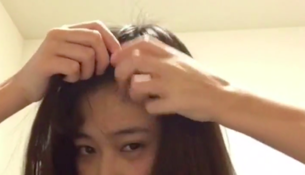 前髪のわけめにそって、後ろやサイドの髪を前にもってきます。