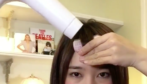 カーラーがとれないようにしっかりとおさえながら、ドライヤーで温風をあてていきます。髪全体に熱が通っていないと上手くクセがつかないので、カーラー全体にしっかり温風をあててくださいね。