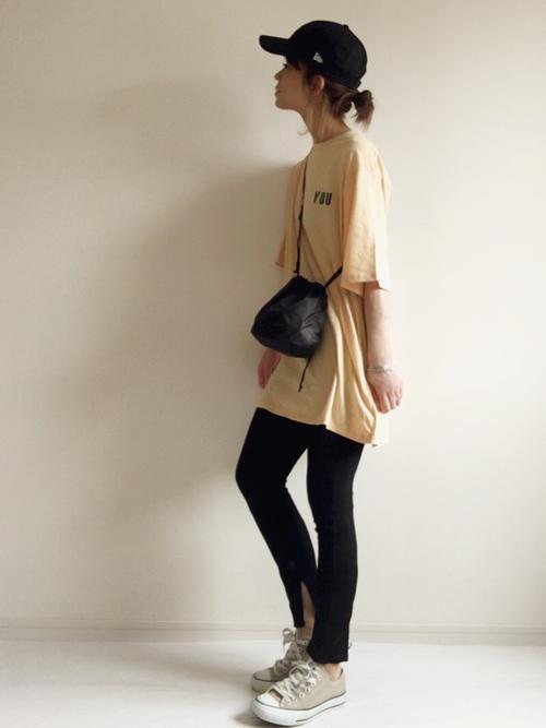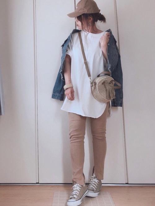 大きめの白Tにレギンスを合わせたこちらのスタイル。ベージュのレギンスはどんなコーデにも合いますよね♪