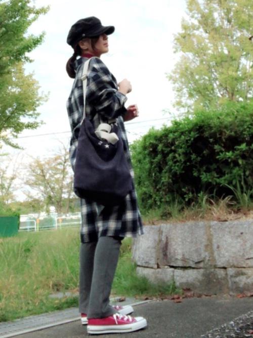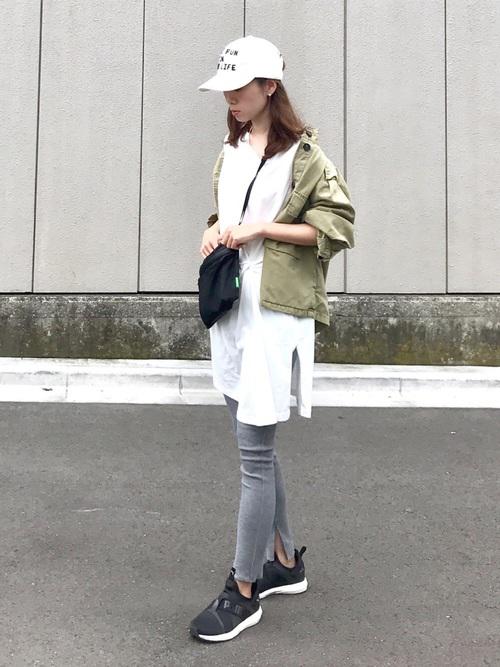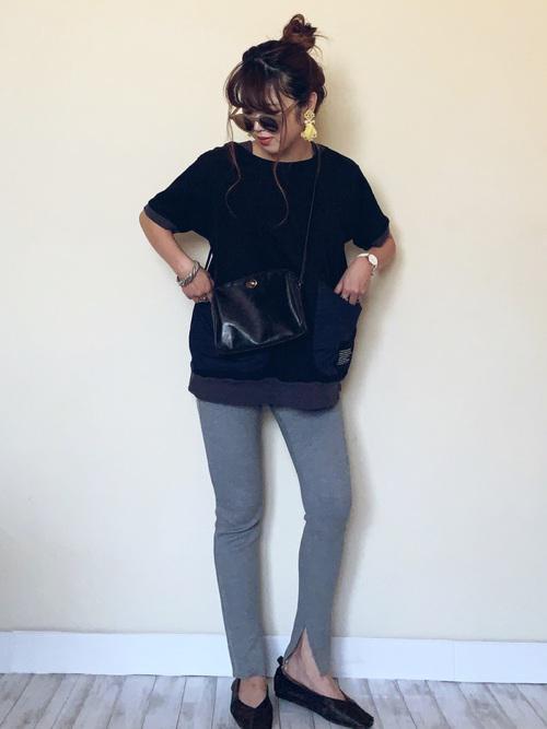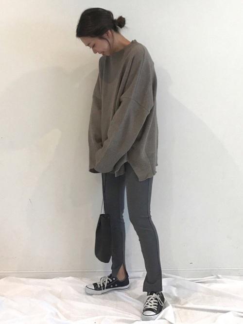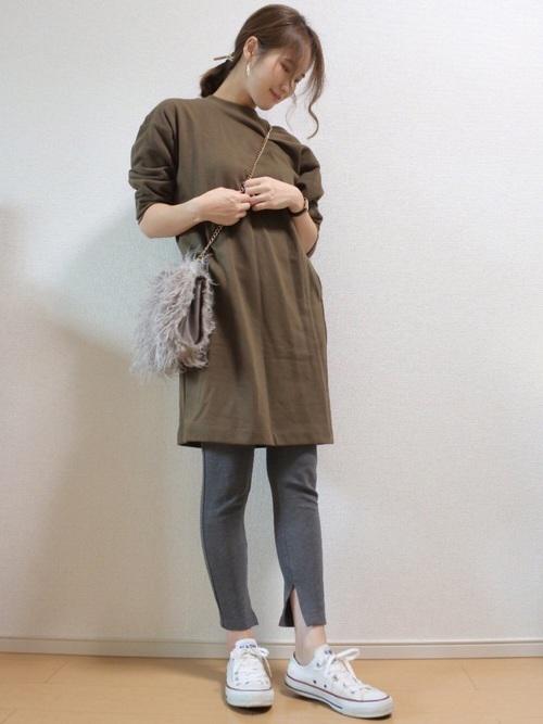 こちらもグレーのレギンスを使ったコーデ。裾がストレートなので、脚長効果も狙えます。