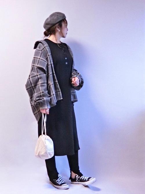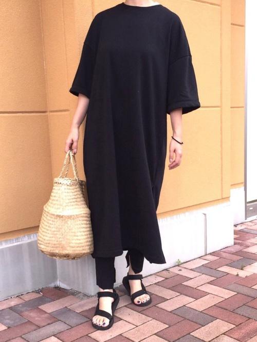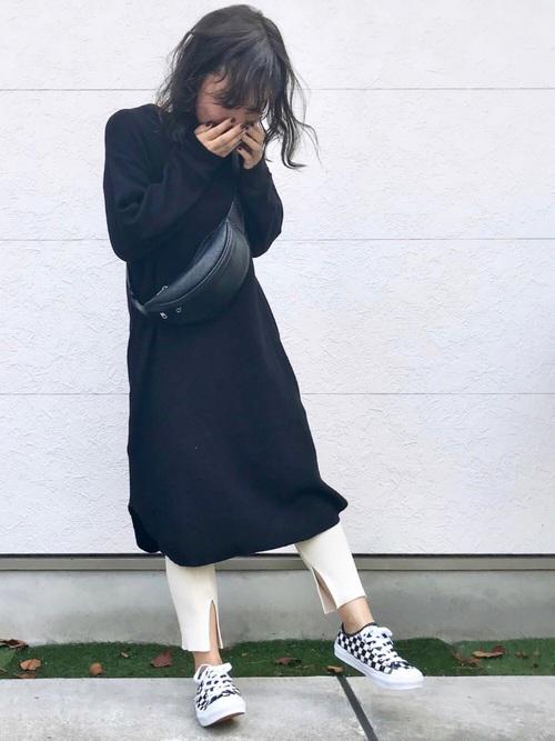 上下黒で統一されたコーデ。スリット入りなので、ロングワンピの下に着ても全然重たく感じません◎
