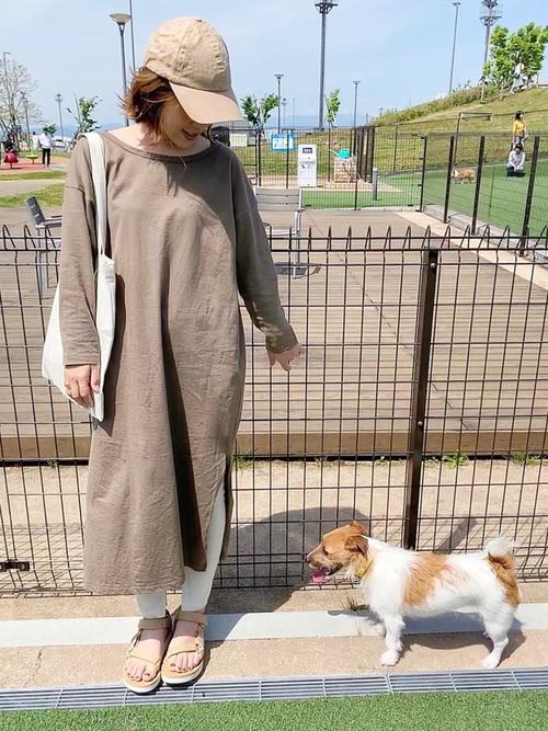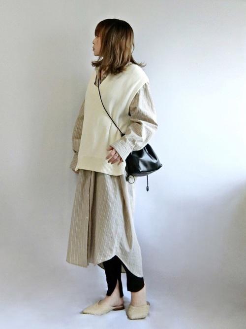 膝丈ワンピ×白レギンスは、実はこんなにきれいに着れるんですよ。ワンピースにスリットが入っているので、すっきりして見えますよね◎