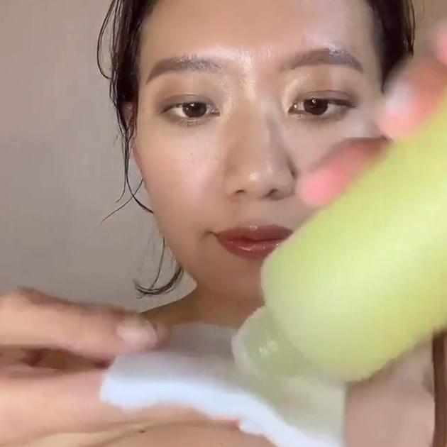 頬にシートを置き、液を肌に浸透させるイメージでやさしく拭き取ります。反対の頬を拭くときはシートの汚れていない面を使ってくださいね!