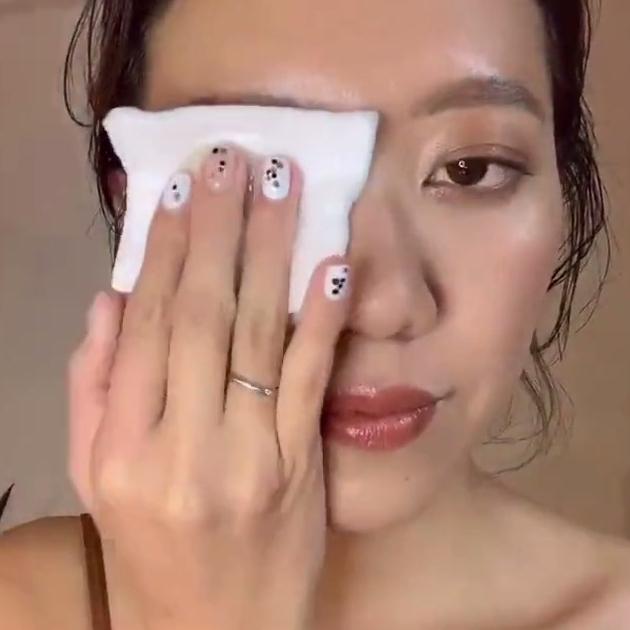 目元にコットンをあてて数秒おきます。そうしてからやさしく拭き取るとメイクがしっかり落ちますよ!