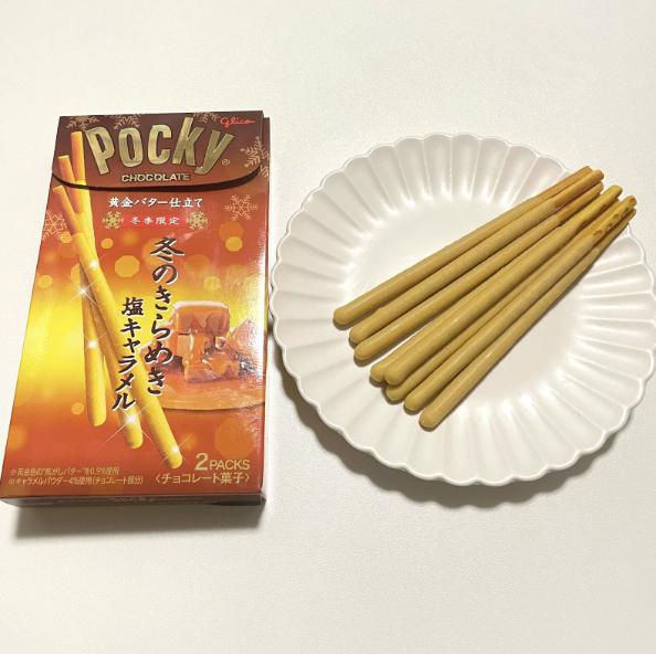 「冬のきらめきポッキー塩キャラメル」はキャラメルの控えめな甘さ、バターの濃厚な味わい、そして表面の塩が絶妙に組み合わさった、一度食べたら病みつきになること間違いなしのポッキーでした。