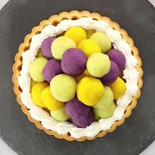 かぼちゃ・さつまいも・紫芋をつぶしたものを丸め、タルトの上に乗せた1品。