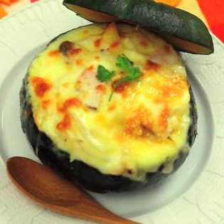 種をくり抜いたかぼちゃに、グラタンを入れて、オーブントースターで焼けば完成です。