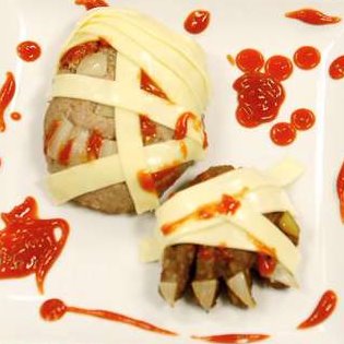 ソーセージをパイシートで巻いたものを指、アーモンドを爪に見たてた「魔女の指ソーセージパイ」。