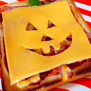 ピザトーストに、ジャッコランタン型に切り抜いたチェダーチーズをのせるだけで簡単にできちゃう♪