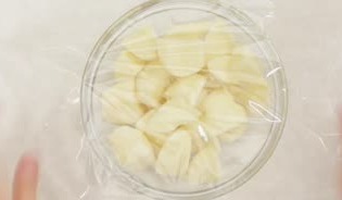 じゃがいもは水でぬらしてからラップをかけ、600Wで5分加熱したら裏返して3分程度加熱します。
