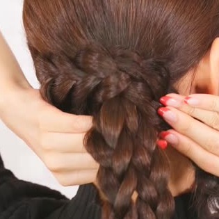 下の三つ編みを上の三つ編みに巻きつけ、ピンで留めます。しっかり巻きつけることで、崩れにくくなりますよ♪